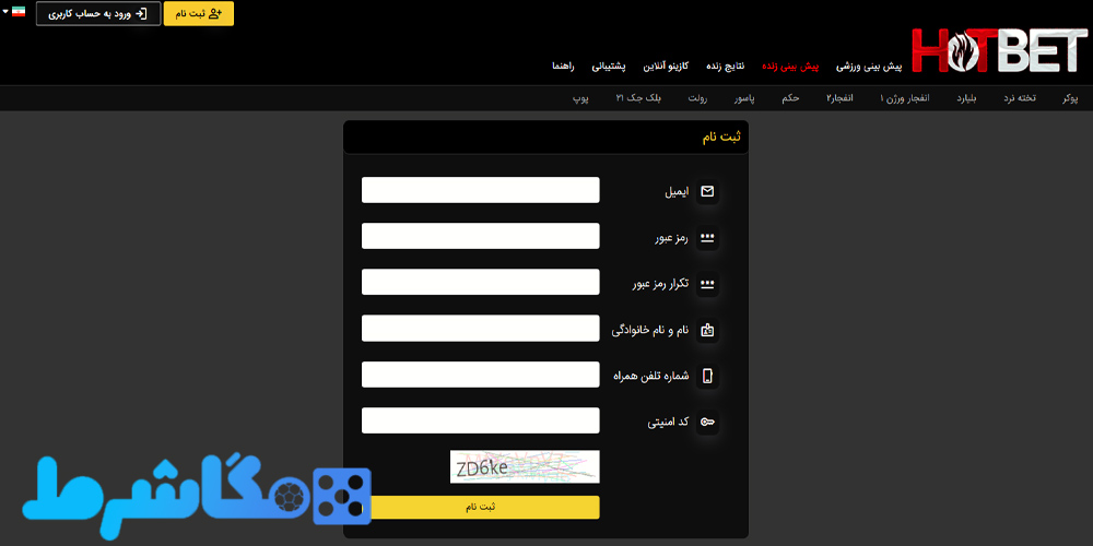 با کلیک روی این گزینه، به صورت مستقیم به فرم ثبت نام منتقل خواهید شد. مراحل ثبت نام در سایت هات بت بسیار ساده و سریع طراحی شده اند و در مدت زمانی کوتاه می توانید حساب کاربری خود را ایجاد کرده و فعالیت خود را آغاز نمایید.