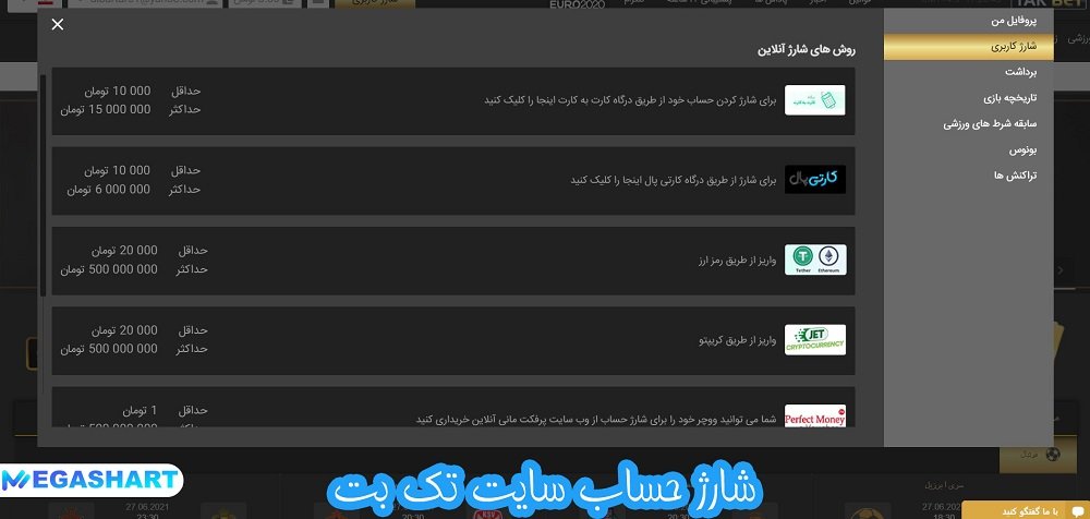 تک بت روش های متنوعی برای شارژ حساب ارائه می دهد که شامل درگاه بانکی مستقیم، کارت به کارت، ووچر پرفکت مانی و ارزهای دیجیتال است. با انتخاب هر یک از این روش ها می توانید موجودی حساب خود را در کوتاه ترین زمان افزایش دهید.