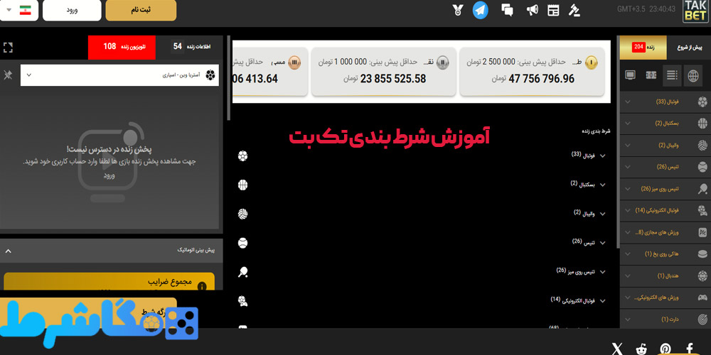 سایت تک بت (TakBet) بخش های شرط بندی متنوعی دارد تا هر کاربر بتواند به راحتی بخش مورد نظر خود را انتخاب کرده و شرط بندی کند. برای استفاده از امکانات شرط بدی سایت، باید ابتدا در این سایت ثبت نام کرده و حساب خود را شارژ نمایید که در بخش های پیشین به طور مفصل توضیح داده شده است. در ادامه آموزش کامل شرط بندی در هر بخش سایت آورده شده است: